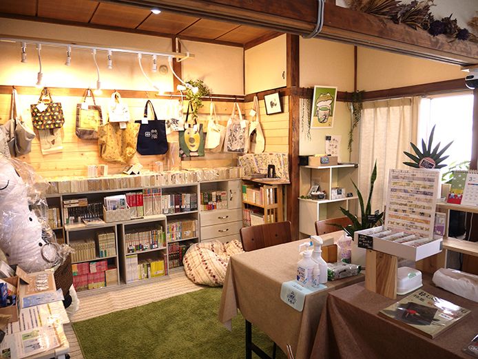 2階はどうなっているのか。急な階段を昇ってみる。うわあ、なんですかこのファンシー空間は! 2階はぬいぐるみやプランターなどの雑貨と、ワークショップや読書会に使えるテーブルとイス、閲覧用の本が置かれている。壁にはギャラリースペースもあり、弥生坂時代と違いカフェではないものの、1階で購入したコーヒーやお菓子で一息つくこともできる。
