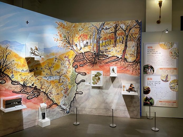 監修者の北山太樹氏をはじめ、国立科学博物館の各分野の研究者がそれぞれの専門を通して解説しているのも、本展の大きな特徴のひとつです。たとえば『地球』(福音館書店)の、秋の里山を地中の断面まで含めて描いた場面では、動物研究部の西海功氏、植物研究部の田中伸幸氏と保坂健太郎氏が、それぞれ鳥、植物、きのこについて解説。研究者目線で見た、かこさんの科学絵本の魅力が伝わってきます。