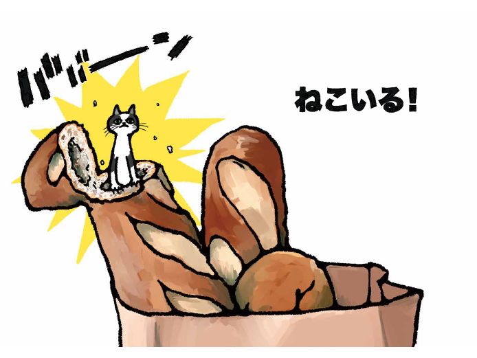 ――本作の最大の魅力は、ページをめくった瞬間のインパクト。猫たちは鳴き声の「ニャー」を封印し、「ババババーン!」といった、勢いのある擬音とともに登場する。