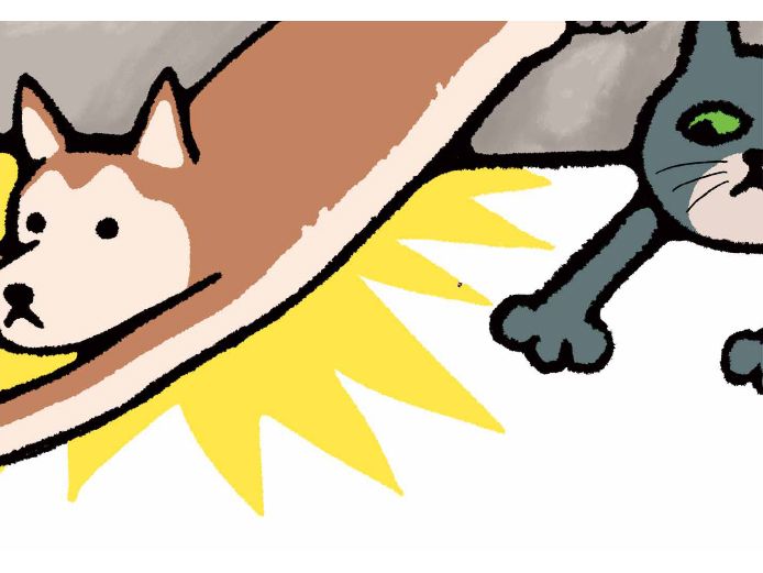 1作目は、読者にこの絵本の楽しみ方を提示するルール説明のような役割もありましたが、2作目ではその説明を一切省き、より猫の数を増やしています。文字の中にまで猫、さらには犬までも……。実は、大人が文字を読み上げるより先に、子どもたちは絵の中に潜む小さな猫をすぐに見つけてしまうんです。その観察の鋭さには、作者の僕も驚かされます。