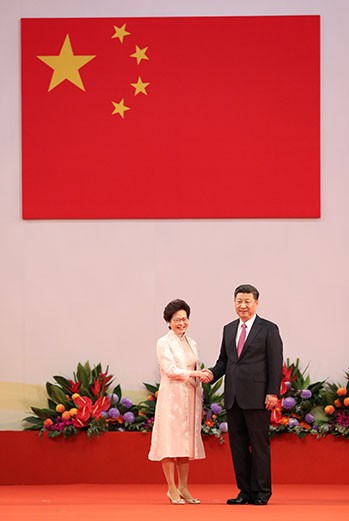 2017年7月1日、香港返還20年式典で握手を交わす中国の習近平国家主席(右)と香港の林鄭月娥・行政長官=香港・湾仔、細川卓撮影 ©朝日新聞社