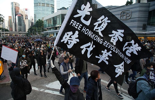 2019年12月8日、香港島の繁華街で旗を振りながら歩くデモ隊=竹花徹朗撮影 ©朝日新聞社