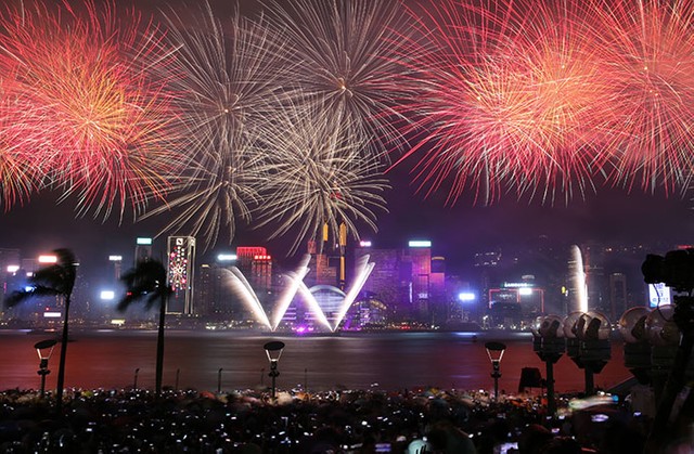 2017年7月1日、香港返還20年を記念し、香港のビクトリア港に花火が打ち上がった=細川卓撮影 ©朝日新聞社