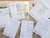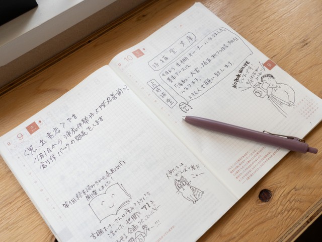 レジカウンターに置かれたノート。訪問者がさまざまなメッセージを書き残していく。