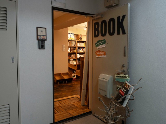 ビルの1階には別のカフェがあり、その脇の階段かエレベーターで2階へ上がると、「本と喫茶 夢中飛行」の入り口がある。