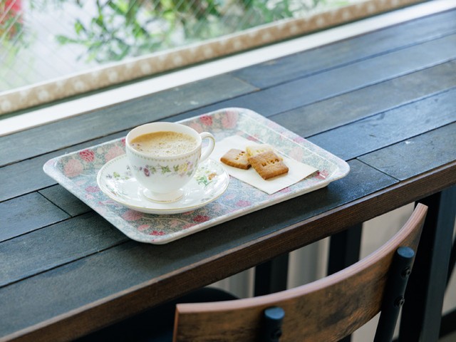 (左)窓に面したカフェスペース。カウンター・テーブルは鈴木さんの自作で、使い込まれた床材を加工して作った(右)