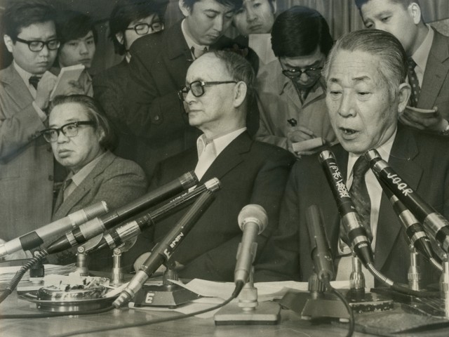 1975年、「明るい革新都政をつくる会」の記者会見に参加した松本清張(左)。この年の都知事選では、美濃部亮吉知事が石原慎太郎らを破って三選を果たした
