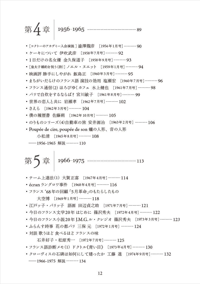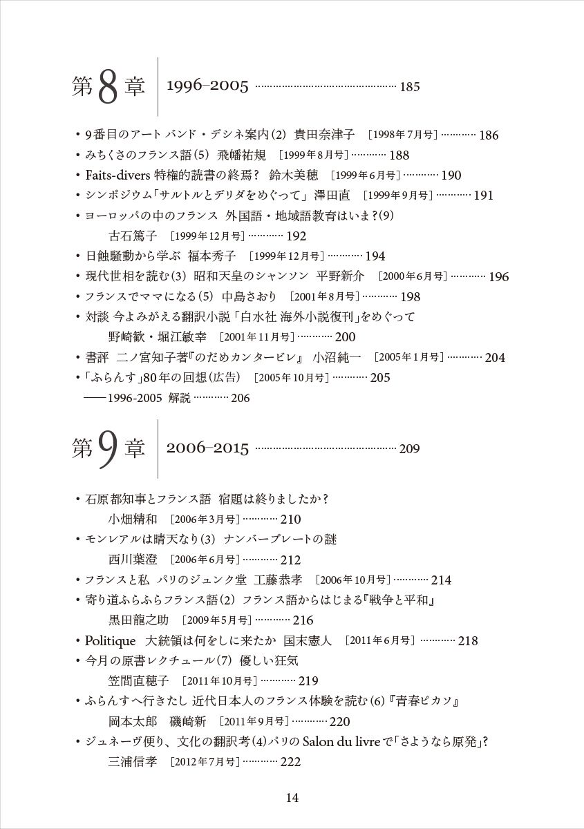 小山:『80年の回想』は、私も含めた雑誌編集経験者4名がコピーを回覧して「面白い」「懐かしい」という観点で選んでいって投票するといった形式をとりました。いわば、編集者の記憶の集積です。ネームバリューのある執筆者や印象深い記事を拾っていく、回顧録的な編集でした。それに公平性を加えるべく、松原秀一先生に「『ふらんす』の80年」、「『ふらんす』と私」という共通タイトルで木下光一先生、佐々木康之先生、鹿島茂先生、堀江敏幸さんの4名の方々にご寄稿していただきました。